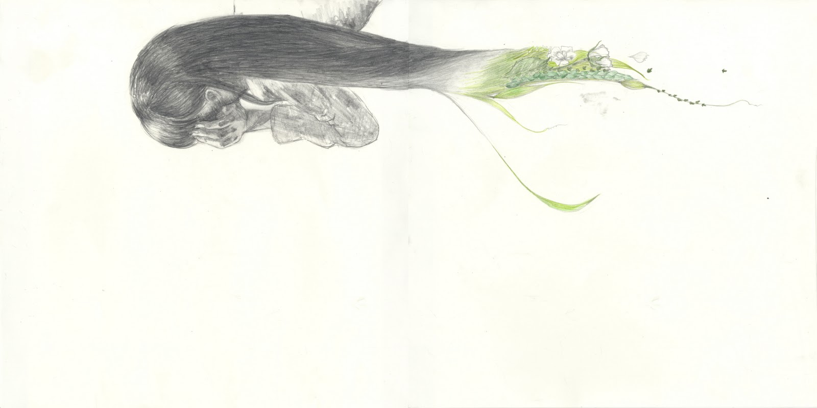 腕を頬にあてて組んでいる女性。長い髪が束をなして垂れ下がる。垂れ下がり螺旋に捩りながら、植物のつるになり、葉になり、花へと変容する。女性の夢想の行く先が髪の先まで行き届いている柔らかな作品。前ラファリエット派的な甘美な変容世界を描き出した佳作である。